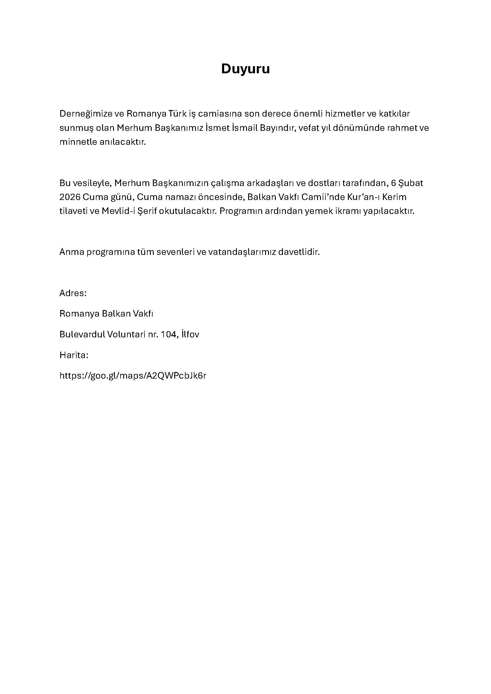 Duyuru Adres:Romanya Balkan VakfıBulevardul Voluntari nr. 104, İlfovHarita:https://goo.gl/maps/A2QWPcbJk6r